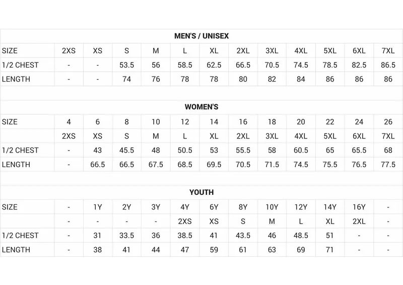 The men's style is a unisex style which is straight through the waist and has a flat hem. The women's style is slightly shaped at the waistline. The youth size is unisex. The half chest measurement is the distance measured from underarm to underarm with the garment lying flat. The length of the garment is measured from the shoulder to the hem with the garment lying flat.