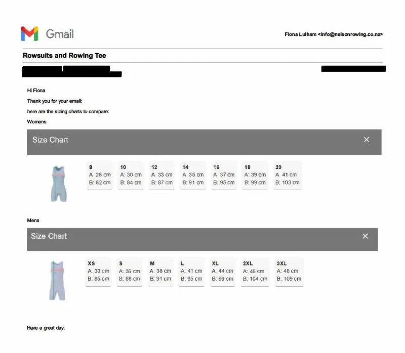 Please refer to the size guide for sizing. A rowsuit should be reasonably tight fitting (not baggy) so it doesn't get caught up in oars or seats. The bottom (black) half is made from stretchy material, the top (coloured) half is made with material that has less "give".